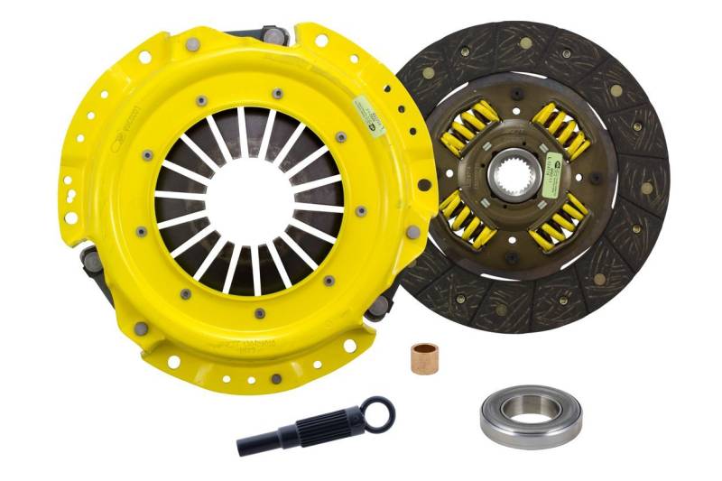 ACT Heavy Duty Performance Street Sprung Clutch Kit NS4-HDSS kit features ACT's most popular Heavy Duty pressure plate and most popular street disc. ACT Heavy Duty pressure plates use exclusive diaphragm design to increase clamp load, reduce deflection and maximize clutch life. All diaphragms endure a four-stage, heat-treating process for unparalleled performance. ACT pressure plates have precision cover stampings to provide rigidity and consistency. ACT's Performance Street discs feature premium organic materials with high copper content for better heat transfer and steel-backed lining for greater burst strength and durability. These discs have reduced marcel for faster shift action to complement ACT pressure plates, with increased strength and reliability. "Excellence in Performance", backed by the best one-year warranty in the industry!