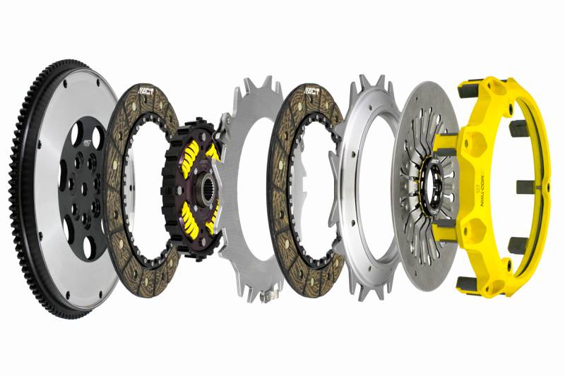 ACT Mod-Twin 225 Heavy Duty Sprung Street Clutch Kit T1S-M01 Mod-Twin 225 HD Sprung Street Kit is designed for high powered AWD street cars. It unites uncompromised pedal feel, durability, engagement quality with very high torque capacity by combining twice the organic friction surfaces with an ultra-durable spring center Mono-Drive hub in a completely modular design. Each diaphragm spring endures an exclusive four-stage heat treating process providing a consistent light pedal feel. Steel-backed Friction Plates with high quality organic friction materials deliver stable friction coefficient, good heat capacity and long clutch life. These Friction Plates uniformly transfer torque to the Mono-Drive sprung hub assembly which extends input shaft life and reduces driveline shock from torsional vibration. This kit includes a CNC-machined and dynamically balanced flywheel, pressure plate cover, diaphragm spring, face, puck-style ceramic friction plates, sprung Mono-Drive hub assembly, floater, patented Monoloc Collar, release bearing, alignment tool and pilot bearing (if needed). Mod-Twin clutches are fully rebuildable and most components can be ordered separately. "Excellence in Performance", backed by the best one-year warranty in the industry!