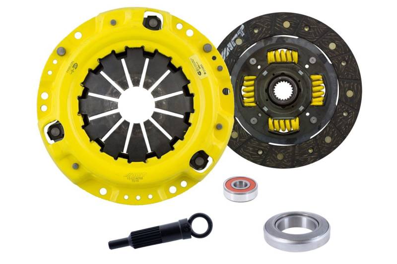 ACT Heavy Duty Performance Street Sprung Clutch Kit TK1-HDSS kit features ACT's most popular Heavy Duty pressure plate and most popular street disc. ACT Heavy Duty pressure plates use exclusive diaphragm design to increase clamp load, reduce deflection and maximize clutch life. All diaphragms endure a four-stage, heat-treating process for unparalleled performance. ACT pressure plates have precision cover stampings to provide rigidity and consistency. ACT's Performance Street discs feature premium organic materials with high copper content for better heat transfer and steel-backed lining for greater burst strength and durability. These discs have reduced marcel for faster shift action to complement ACT pressure plates, with increased strength and reliability. "Excellence in Performance", backed by the best one-year warranty in the industry!