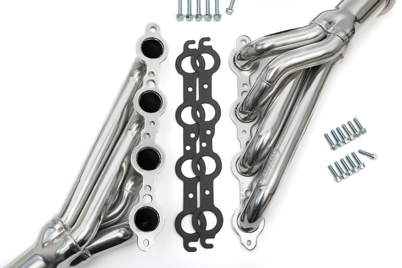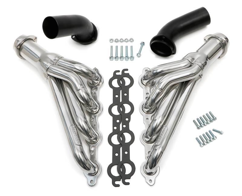 Silver Mid-Length LS Swap Headers For '68-72 Chevelle, El Camino Handcrafted, Mild Steel Construction. The Mid-Length Tube Header Design Provides Significantly More Low and Mid-range Power than Cast Manifolds, and Provide Better Ground Clearance And Component Compatibility Than Long Tube Headers. Ball & Socket Collector Design requires No Gasket, and Allows For More Exhaust System Misalignment than Old School, Gasket-Style Header Collectors Includes All The Necessary Mounting Hardware, Gaskets and Reducers (exhaust adapters) Limted Lifetime Warranty On Construction, Five Year Warranty on Factory-Applied Header Coating!
