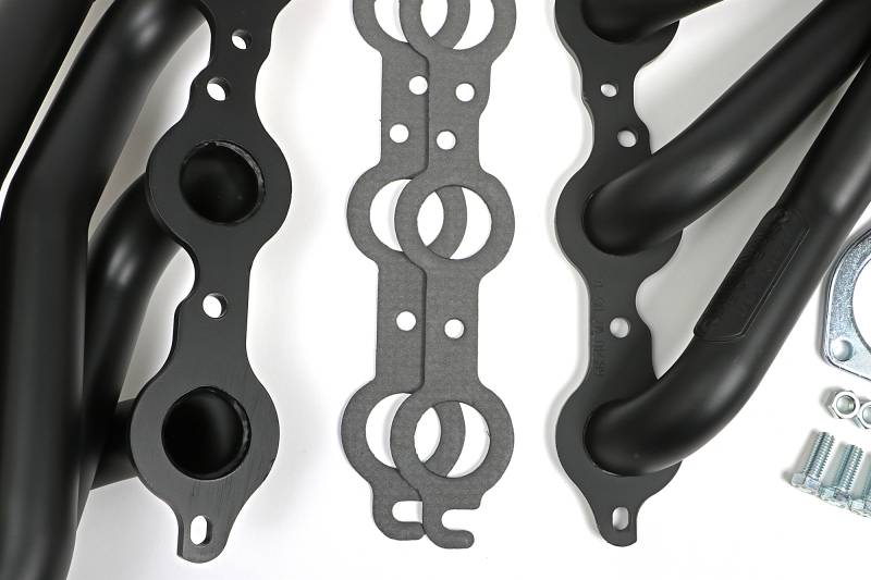Black Mid-Length LS Swap Headers For 1964-67 GM A-Body Cars Handcrafted, Mild Steel Construction. The SHORTER Tube Header Design Provides Significantly More Low and Mid-range Power than Cast Manifolds, and Provide Better Ground Clearance And Component Compatibility Than Long Tube Headers. Ball & Socket Collector Design requires No Gasket, and Allows For More Exhaust System Misalignment than Old School, Gasket-Style Header Collectors Includes All The Necessary Mounting Hardware, Gaskets and Reducers (exhaust adapters) Limted Lifetime Warranty On Construction, Five Year Warranty on Factory-Applied Header Coating!