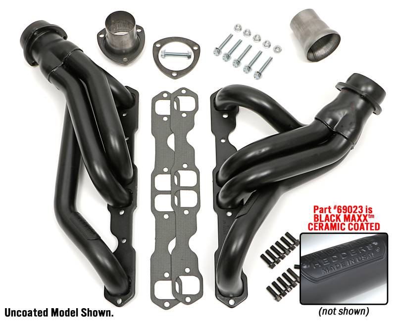 BLACK MID-LENGTH 1-3/4 IN. HEADERS For 67-87 C10 TRUCKS w/283-400 Handcrafted, Mild Steel Construction. The Mid-Length Tube Header Design Provides Significantly More Low and Mid-range Power than Cast Manifolds, and Provide Better Ground Clearance And Component Compatibility Than Long Tube Headers. Ball & Socket Collector Design requires No Gasket, and Allows For More Exhaust System Misalignment than Old School, Gasket-Style Header Collectors Includes All The Necessary Mounting Hardware, Gaskets and Reducers (exhaust adapters) Limited Lifetime Warranty On Construction, Five Year Warranty on Factory-Applied Header Coating!