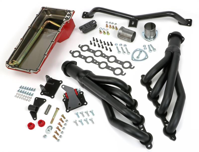 This Swap-In-A-Box Kit is developed specifically for installing an LS engine and automatic transmission into 1973-87 Chevy/GMC C10/C15 and C20/C25 Pickup Trucks and Suburbans (2WD). This kit is not for 4WD truck or Blazer applications. This comprehensive kit includes a pair of mild steel, Satin Black ceramic-coated Mid-Length headers with gaskets, bolts and exhaust adapters, a complete engine mount kit with hardware and rubber pads, LS swap engine oil pan with bolts, gaskets and special pick-up tube, and a transmission crossmember for use with a 4L60E, 4L70E, 4L80E, 4L85E, 6L85E and 6L90E automatic transmission.