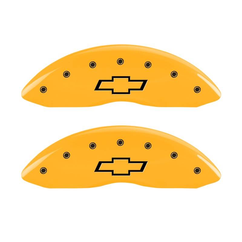 Front set 2 caliper covers, Engraved Front: Bowtie, Yellow powder coat finish, b MGP Caliper Covers are a car accessory designed and manufactured specifically for your 2007-2013 Chevrolet Silverado to cover up and hide those ugly brake calipers. These aluminum caliper covers are finished with a high-quality powder coat. MGP caliper covers will enhance your wheel appearance and curbside appeal with either black, yellow or red caliper covers. MGP Brake Caliper Covers are tested for safety fitment and are licensed by major manufacturers.