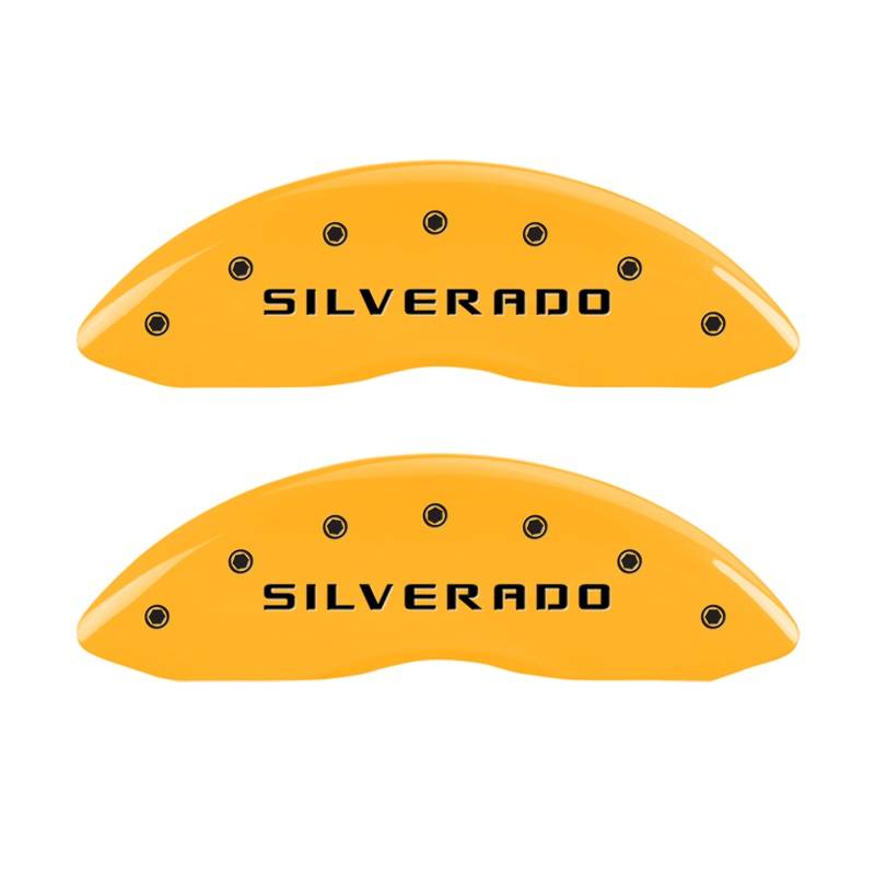 Front set 2 caliper covers, Engraved Front: Silverado, Yellow powder coat finish MGP Caliper Covers are a car accessory designed and manufactured specifically for your 2007-2013 Chevrolet Silverado to cover up and hide those ugly brake calipers. These aluminum caliper covers are finished with a high-quality powder coat. MGP caliper covers will enhance your wheel appearance and curbside appeal with either black, yellow or red caliper covers. MGP Brake Caliper Covers are tested for safety fitment and are licensed by major manufacturers.