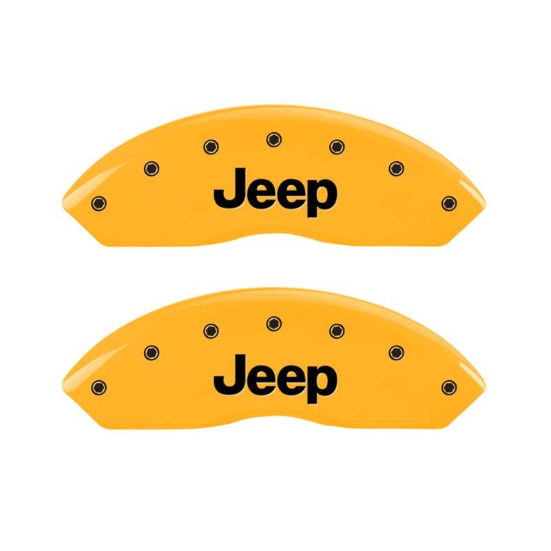 Front set 2 caliper covers, Engraved Front: JEEP, Yellow powder coat finish, bla MGP Caliper Covers are a car accessory designed and manufactured specifically for your 1997-2006 Jeep Wrangler to cover up and hide those ugly brake calipers. These aluminum caliper covers are finished with a high-quality powder coat. MGP caliper covers will enhance your wheel appearance and curbside appeal with either black, yellow or red caliper covers. MGP Brake Caliper Covers are tested for safety fitment and are licensed by major manufacturers.