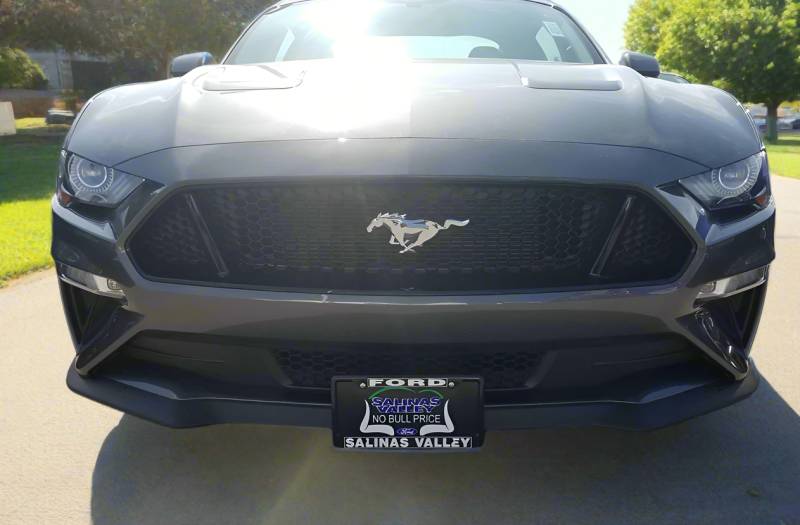 For 2018-2023 Ford Mustang w/ performance pack This bracket fits the 2018-2023 Mustang with the performance pack, 2018-2023 California Special and 2019-2021 GT Bullitt. You want to avoid drilling holes in your bumper? Want to avoid expensive fines and tickets for not having a front license plate? Easily remove your front plate with only the tug of a spring loaded pull pin, the remaining base plate is undetectable Capture all the action with our GoPro compatible camera mount Save your bumper- no holes are required in the FRONT of your bumper