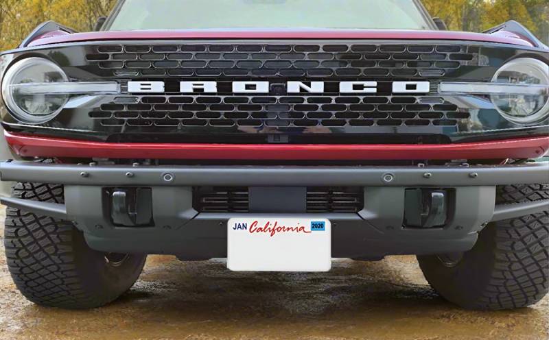 For 2021-2024 Ford Bronco with HD Modular Bumper and Adaptive Cruise Control This bracket fits the 2021-2024 Ford Bronco with HD Modular Bumper and Adaptive Cruise Control. Constructed of 5052 and 6061 aluminum, welded and anodized black, this bracket is built to last. All parts required for installation included, however, tools are required. Requires no holes to be drilled for installation. Made in USA. You want to avoid drilling holes in your bumper? Want to avoid expensive fines and tickets for not having a front license plate? Easily remove your front plate with only the tug of a spring loaded pull pin, the remaining base plate is undetectable Capture all the action with our GoPro compatible camera mount Save your bumper- no holes are required in the FRONT of your bumper