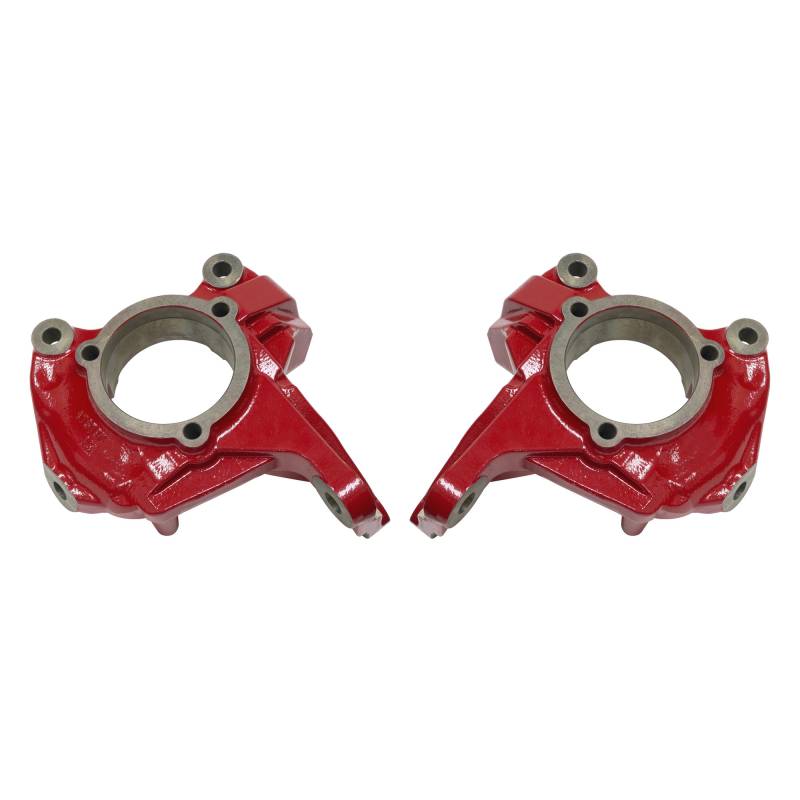 Steering Knuckle Kit Los nudillos de dirección de espacio libre Rancho® agregan 1.5 pulg. de espacio libre en los modelos Jeep® Wrangler JK levantados para proteger los componentes de la dirección y levantar la articulación de la dirección lejos de los obstáculos fuera de la carretera. El kit incluye dos nudillos y 3 pulgadas. topes de choque. COMPATIBILITY -- Designed for 3-in. and higher lifted Jeep Wrangler JK with Dana 30 and Dana 44 axles BUILT FOR THE TRAIL -- Adds 1.5-in. of clearance to protect steering components and lift steering linkage away from rocks and other obstacles while off-roading, rock crawling and trail riding REDUCES BUMP STEER -- Aligns geometry of track bar and drag link to reduce bump steer RESISTS CORROSION -- Durable red powder-coat finish resists rust and corrosion ENGINEERED TO LAST -- Made of high-strength steel for long life