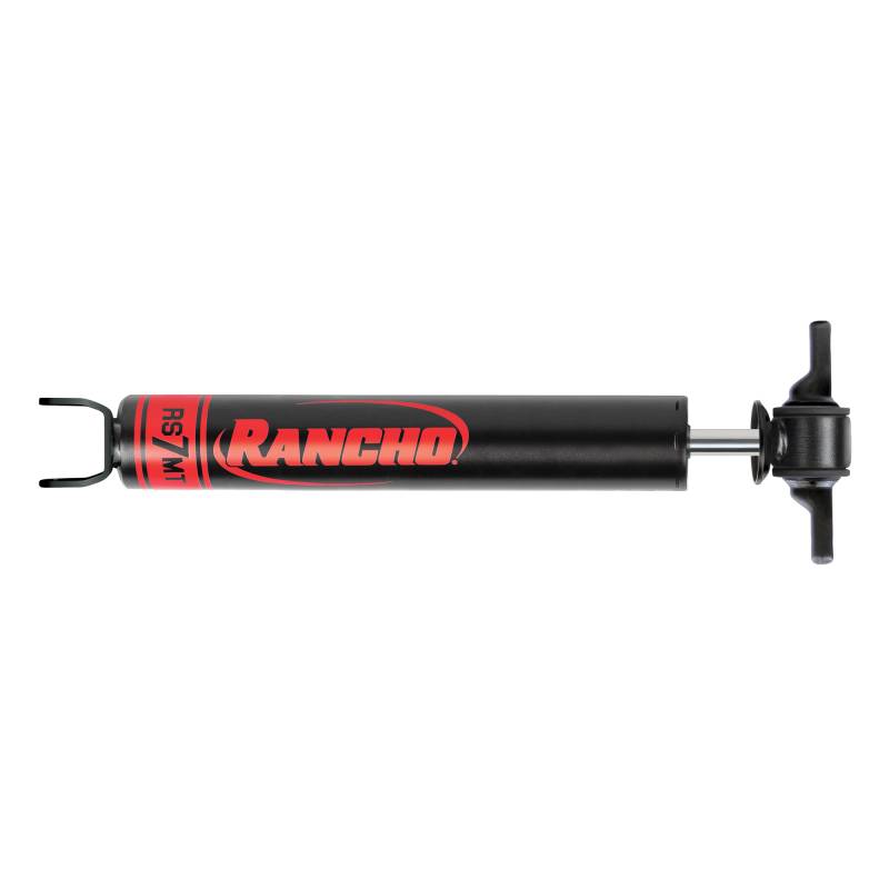 RS7MT Suspension Shock Absorber Application tuned for precision on-road and off-road handling, Rancho® RS7MT® monotube shocks are highly effective in the dissipation of heat, making them ideal for extreme off-road use and larger wheel and tire packages. RS7MT shocks feature an integrated dirt wiper sealing system that keeps dirt and debris out, hardened piston rod that resists scuffs and corrosion plus an internal rebound bumper to smooth out your ride on any terrain. PRECISE HANDLING AND PERFORMANCE -- Deflective Disc Valving features digressive, linear or progressive tuning based on application requirements for precision handling and performance on- and off-road STRONG AND DURABLE -- Features a 14mm hardened chrome piston rod to resist scuffs & corrosion, double-welded loops at stress areas, double strength closure method and hot form reserve tube HANDLES EXTREME TEMPERATURE CHANGES -- Large 2-in. monotube body filled with all-weather fluid allows for cooler operation, increased vehicle control and ability to withstand internal temperatures of -40 to 248°F REDUCES FADE -- Full-floating dividing piston and high-pressure nitrogen gas maintains constant pressure against the hydraulic oil, reducing aeration and shock fade SMOOTH PERFORMANCE -- Internal rebound bumper and shouldered rubber bushings help reduce noise, vibration and ride harshness while the PTFE-banded piston enhances responsiveness to changing road conditions for an overall smoother ride
