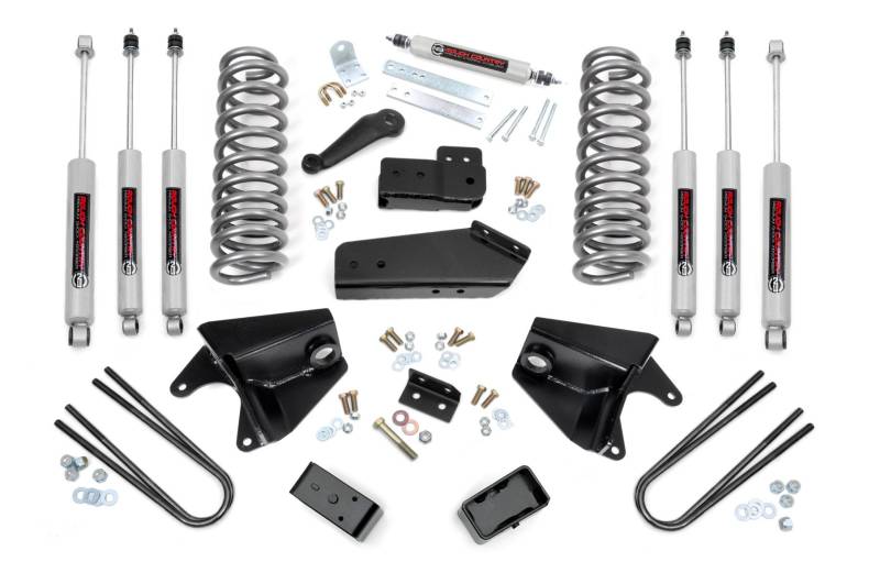 Level Up Your Stance and Style: Give your quad shock factory-equipped 1980-1996 Ford F-150 a bold, aggressive look from front to rear with Rough Country's 4" Suspension Lift Kit. This easy-to-install system levels the front with the rear, eliminating the factory rake for a clean, balanced profile and commanding presence on and off the road.Improved Ground Clearance and Ride Quality: Featuring durable front coil springs, this kit delivers increased ground clearance while maintaining excellent ride comfort and performance. Precision-engineered radius arm and axle drop brackets ensure all components stay in optimal alignment, preserving that factory-like ride feel after the lift.Premium Components for Maximum Durability: The fabricated rear lift blocks included in this kit are built tougher than standard cast iron blocks, offering greater strength and long-term reliability, perfect for heavy-duty applications and rugged use.Performance-Tuned N3 Shock Absorbers: Enjoy a superior blend of off-road performance and on-road comfort with Rough Country's nitrogen-charged N3 shocks. These high-pressure shocks feature a 10-stage variable valving system, a durable 18mm spring-loaded piston rod, and a fast-cooling 54mm shock body for consistent performance in any condition.Upgrade Options for Added Strength: This lift is available with optional replacement rear leaf springs, giving you the flexibility to enhance your load capacity and rear suspension performance as needed.Room for 33-Inch Tires: Rough Country's 4" Lift Kit gives you the clearance to run up to 33" tall tires, transforming your Ford's capability and stance with the aggressive look you want.Backed by a Limited Lifetime Warranty: Enjoy peace of mind knowing your investment is protected by Rough Country's Limited Lifetime Replacement Warranty.