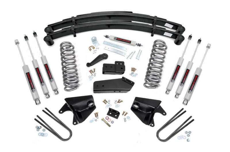 Level Up Your Stance and Style: Give your quad shock factory-equipped 1980-1996 Ford F-150 a bold, aggressive look from front to rear with Rough Country's 4" Suspension Lift Kit. This easy-to-install system levels the front with the rear, eliminating the factory rake for a clean, balanced profile and commanding presence on and off the road.Improved Ground Clearance and Ride Quality: Featuring durable front coil springs, this kit delivers increased ground clearance while maintaining excellent ride comfort and performance. Precision-engineered radius arm and axle drop brackets ensure all components stay in optimal alignment, preserving that factory-like ride feel after the lift.Premium Components for Maximum Durability: The fabricated rear lift blocks included in this kit are built tougher than standard cast iron blocks, offering greater strength and long-term reliability, perfect for heavy-duty applications and rugged use.Performance-Tuned N3 Shock Absorbers: Enjoy a superior blend of off-road performance and on-road comfort with Rough Country's nitrogen-charged N3 shocks. These high-pressure shocks feature a 10-stage variable valving system, a durable 18mm spring-loaded piston rod, and a fast-cooling 54mm shock body for consistent performance in any condition.Upgrade Options for Added Strength: This lift is available with optional replacement rear leaf springs, giving you the flexibility to enhance your load capacity and rear suspension performance as needed.Room for 33-Inch Tires: Rough Country's 4" Lift Kit gives you the clearance to run up to 33" tall tires, transforming your Ford's capability and stance with the aggressive look you want.Backed by a Limited Lifetime Warranty: Enjoy peace of mind knowing your investment is protected by Rough Country's Limited Lifetime Replacement Warranty.