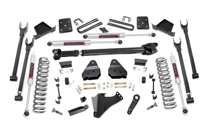 Gain greater travel and improved handling while adding ground clearance and aggressive style with Rough CountryΓÇÖs 4-Link F-250 Lift Kit.This innovative kit allows you to replace your factory arms with a 4-Link setup, using Rough CountryΓÇÖs durable, fixed upper arms and adjustable lower control arms. A set of radius arm drop brackets maintain proper geometry and allow for proper caster setting, which is crucial to maintain factory handling.This kit includes a set of lifted coil springs, radius arm drop-brackets, and ultra-durable, fabricated Anti-wrap rear blocks that prevent binding and axle wrap. This kit also includes stainless steel extended brake lines and brake line brackets to ensure you have everything you need to install your lift. Best of all, this kit features Rough CountryΓÇÖs Nitrogen-Charged N2.0 Shock Absorbers for the ultimate balance in off-road performance and a smooth highway ride. Includes Rough CountryΓÇÖs Lifetime Replacement Warranty