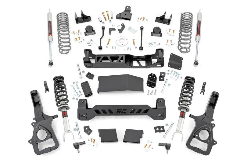 Transform your 5th generation RAM 1500 into an unstoppable off-road BEAST with Rough Country's complete 6in Suspension Lift Kit. This all-inclusive system delivers an aggressive, commanding stance that perfectly complements your truck's rugged new design.Preserve Your Smooth Factory Ride: Experience the same comfortable and controlled driving feel you love. Our kit maintains a smooth factory-like ride quality so every journey, on-road or off, is just as comfortable as before.Boost Your Ground Clearance for Ultimate Off-Road Confidence: Gain plenty of added clearance to tackle the toughest trails and obstacles with ease. The 6-inch lift lets you run up to massive 35-inch tires for a bold look and enhanced off-road capability.Achieve a Balanced, Aggressive Stance: Level your RAM's front and rear for a sleek, aggressive profile that turns heads everywhere you go. The kit includes precision-engineered front and rear crossmembers, each laser-cut with the iconic RC logo for a fierce yet streamlined appearance.Optimized Ride Quality with Application-Specific Springs: Enjoy improved handling, ride comfort, and load support thanks to dual-rate rear coil springs (optional upgrade) tailored for your RAM. Whether cruising highways or conquering rocky terrain, this kit adapts seamlessly.Fully Configurable with Premium Shock Options: Customize your ride quality with shock absorbers that match your driving style, from nitrogen-charged N3 shocks for balanced performance to the premium Vertex reservoir shocks for the ultimate ride. Enhanced Steering and Fitment: An upgraded outer tie-rod reduces bump steer and optimizes turning precision. Plus, it allows you to fit a wider variety of wheels without compromise.Clean Installation with Long-Term Durability: All components are designed with drop brackets and proper geometry to keep your truck looking sharp and functioning flawlessly, no loose parts or unsightly hangers. Backed by Rough Country's Limited Lifetime Replacement Guarantee, this kit is built to last.Upgrade your RAM 1500 with Rough Country's 6in Suspension Lift Kit, dominate the trails, look the part, and drive like a champion every mile of the way.