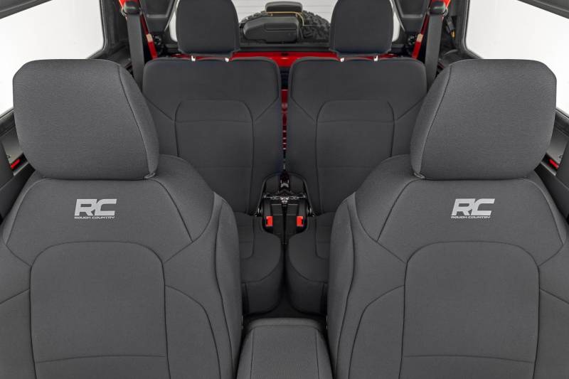 Want to protect your seats or are your seats showing signs of wear and tear from daily use? Say goodbye to unsightly stains and deterioration with Rough Country's Neoprene Seat Covers - the ultimate solution for preserving your vehicle's interior.Snug Fit for Optimal Protection: Our seat covers are tailored to fit your seats perfectly, providing a protective barrier against spills, scratches, and everyday wear and tear.Factory-Spec Construction: Engineered to meet factory specifications, our covers blend seamlessly with your vehicle's interior, giving it a fresh, new look without compromising on quality or style.Four-Layer Defense: With a four-layer construction featuring foam padding and a durable polyester shell, our seat covers offer unmatched protection and longevity, ensuring your seats stay looking new for years to come.Breathable and Water-Resistant: The neoprene layer not only provides breathability for added comfort but also boasts water-resistant properties, safeguarding your seats from spills and stains.Complete Coverage: Our covers come with full protection for your front seats, including headrest covers where applicable, as well as rear covers to shield your back seats from children and pet-related mishaps.Peace of Mind Warranty: Rest easy knowing your purchase is backed by our two-year warranty, giving you confidence in the durability and reliability of our product. Don't let worn-out seats diminish your driving experience. Upgrade to Neoprene Seat Covers today and enjoy a fresh, stylish interior that's protected against the rigors of daily life on the road.