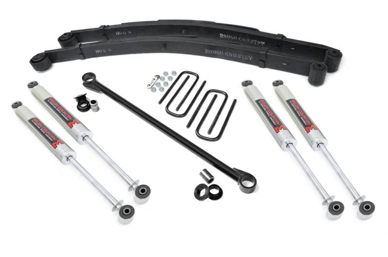 Give your 99-04 Ford Super Duty shocking good looks front to back with Rough Country's 2.5" Ford Leveling Kit! This easy-to-install lift kit raises the front of your vehicle to be equal height with the rear for a leveled, better-than-stock look that gives an improved ride height and more aggressive appearance.\ This kit features a set of front, lifted leaf springs allowing you gain additional ride height without sacrificing ride quality or performance. A HD track bar is provided to keep everything at optimum angles for a factory-like ride, even after lifting.\ A set of Rough Country's premium N3 shocks are also included. These fine tuned 10-stage variable high-pressure Nitrogen charged shocks offer a fantastic blend of off-road action and smooth highway ride quality. With a durable 18mm spring-loaded piston rod and faster-cooling 54mm shock body.\ Best of all, Rough Country's 2.5" Ford Leveling Kitis backed by our Lifetime Replacement Warranty.