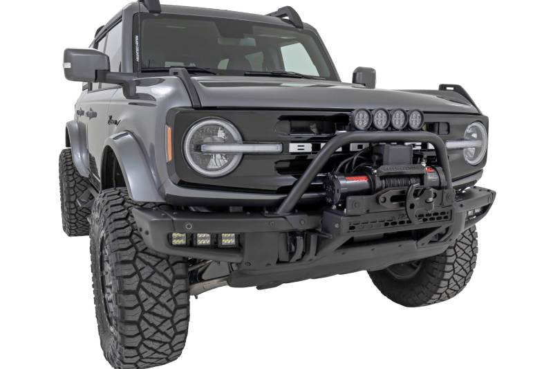Rugged Style and Protection. Create a custom front-end look with the Rough Country Bronco Safari Bar. Rough Country's Bronco Safari Bar is just what you need. Offering protection from both on and off-road hazards, it's perfect for tackling any adventure. Plus, with multiple LED mounting solutions, you can be sure you'll have plenty of light - no matter where you go. And if you're looking to add a winch, the Safari Bar works perfectly with Rough Country's High Mount Winch Kit. This is the perfect accessory for off-roading enthusiasts who strive to go farther and higher every time they hit the trails.\ Built to Withstand. The Rough Country Bronco Safari Bar is the perfect accessory if you're looking to get your Bronco ready for an adventure. This tough bar is made from high-quality steel with 1 7/8" x .095" wall tubing to ensure maximum strength. The mounting flanges are also made from 7-gauge material, so you know it's built to last. In addition, it comes in a corrosion-resistant black powder coat finish to withstand even the most challenging terrain. Rough Country's Bronco Safari Bar is a perfect choice if you're tackling rugged trails or just want to add a little extra style to your ride.\ Installation and Warranty. This easy-to-install bar is perfect for anyone looking to take their Bronco to the next level. The Safari Bar mounts directly to your modular bumper using factory hardware and can be installed as a stand-alone unit. You also get peace of mind knowing that your purchase comes with a limited lifetime replacement warranty for manufacturer defects. With Rough Country's industry-leading warranty, you can be sure that your Rough Country lift kit is protected from structural and workmanship damage after purchase.