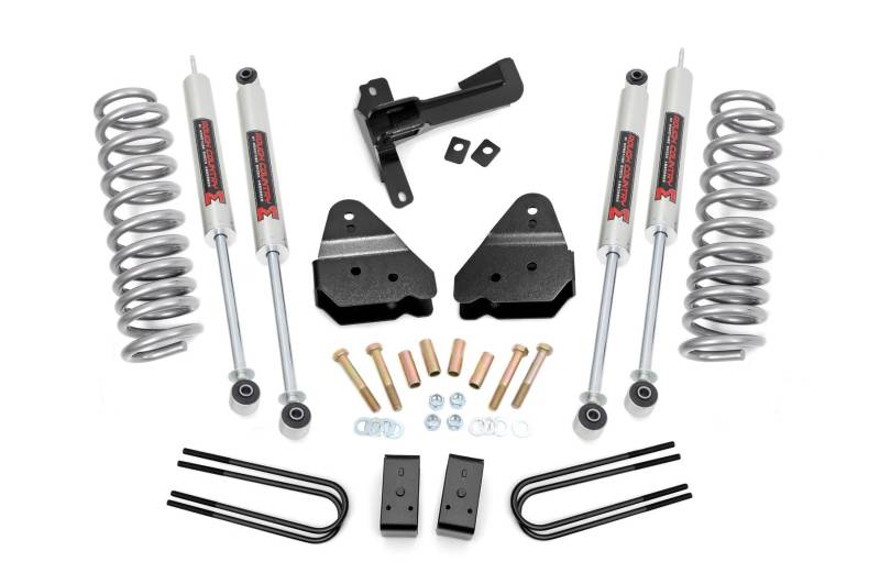 Superior Looks. Give your fourth generation Ford Super Duty an impressive upgrade, front to back with Rough Country's 3" Suspension Lift Kit! This easy-to-install lift kit raises the front of your vehicle to be equal height with the rear for a leveled, better-than-stock look that gives an improved ride height and more aggressive appearance.\ Durable Components. This kit features a set of front, lifted coil springs allowing you to gain additional ride height without sacrificing ride quality or performance. A set of radius arm drop brackets as well as a track bar drop bracket is provided to keep everything at optimum angles for a factory-like ride, even after lifting. Get the wheels you want! Rough Country's 3" Suspension Lift Kit comes with everything you need to fit up to a 35" tire with proper wheel backspacing.\ Installation. Requiring minor trimming to install, an estimated timeframe of 3-4 hours is recommended to complete this full installation. This full kit can be installed at home and can be completed efficiently and quickly!\ Limited Lifetime Replacement Warranty. Rough Country's 3" Suspension Lift Kit is backed with a limited lifetime replacement warranty towards manufacturer defects. As such, the product is protected from structural and workmanship damage after the date of purchase. With our industry-leading warranty give yourself peace of mind when using Rough Country's Suspension products!
