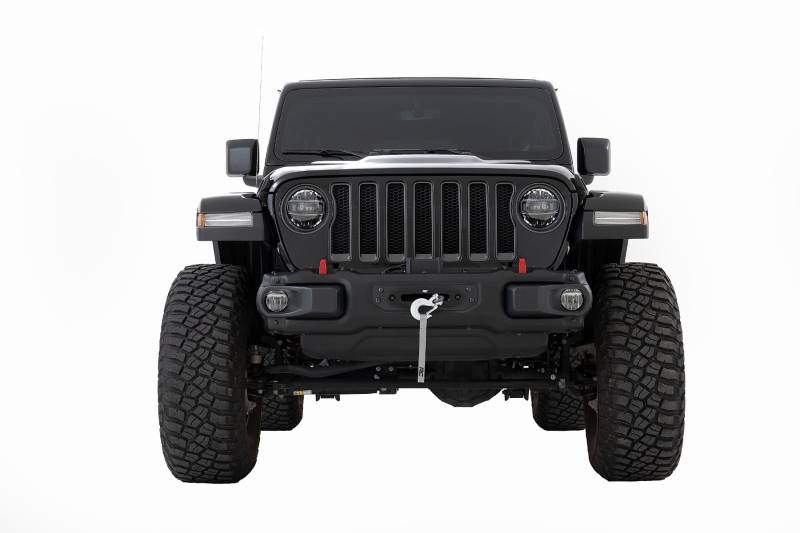 Superior Style. Get ready for off-road adventures with Rough Country's Winch Mounting Plate for the Jeep Wrangler JL 4WD. This stylish recovery solution is hidden behind the OEM modular steel bumper for a sleek look while still providing the functionality you need. The standard 4.5in x 10in 4 bolt mount will accommodate most winches on the market, giving you the versatility to choose the right winch for your needs. Heavy-Duty Steel Construction. Rough Country's Winch Mounting Plate is the perfect addition to your JL. With its durable black carbon powder coating and heavy-duty 7GA steel construction, this mounting plate can handle anything the off-road throws at it. It has been engineered NOT to impede airflow to the radiator, so you can tackle any obstacle without worrying about your engine overheating. The flush design leaves only the hawse fairlead and tow hook exposed, giving your Jeep a clean, polished look while ensuring maximum functionality. Installation and Warranty. Since the front bumper stays in its stock location, installing our Winch Plate is a breeze and can be completed by just one person. And with Rough Country's commitment to quality, you can have peace of mind with the included Limited Lifetime Warranty.