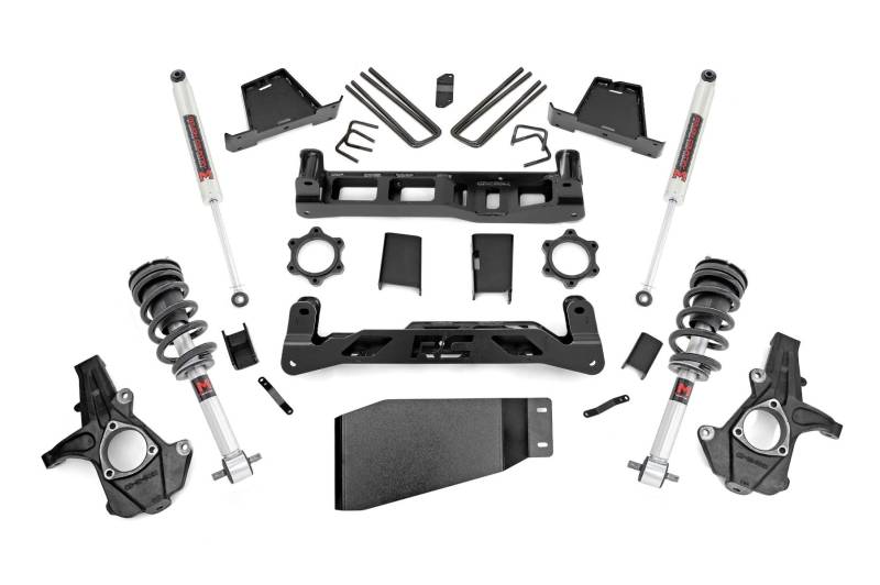 Go Big with Confidence: Rough Country's 7.5-inch Suspension Lift Kit for your Chevy Silverado 1500/GMC Sierra 1500 delivers towering ride height, aggressive stance, and the clearance to run 35-inch tires all while using your factory 20-inch wheels. No wheel upgrades needed to dominate the trails.Clean, Level Stance from Front to Rear: Say goodbye to factory rake. This lift kit achieves a balanced, level profile that looks just as tough as it performs, giving your truck a commanding presence on and off the road. Engineered for Ground-Clearing Performance: Our signature high-clearance crossmembers feature a low-profile design with the iconic "RC" logo, giving you maximum ground clearance and trail-readiness. A heavy-duty lower skid plate and precision-engineered sway-bar and differential drop brackets further enhance durability and protection.Install Made Easy No Cutting Required: Designed with convenience in mind, this kit requires zero drivetrain, exhaust, or differential modifications. Even better, there's no need to disassemble your struts making installation faster and smoother than traditional lift systems. Durability You Can Depend On: All components are precision laser-cut using advanced CAD technology, ensuring an exact fit and rock-solid durability. The included rear 6.5-inch heavy-duty fabricated lift blocks are stronger and more reliable than standard cast options and feature anti-wrap technology to preserve your factory ride quality.Customize Your Ride: This kit is fully compatible with your choice of Rough Country shock and strut options from our value-packed, nitrogen-charged N3s to the high-performance Vertex reservoir series. Get the ride feel and performance that matches your driving style.