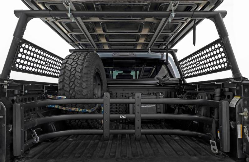 Organize your gear. The Rough Country Toyota Tacoma Bed Rack Molle Panel offers numerous benefits to Toyota owners. Say goodbye to cluttered and disorganized truck beds and take advantage of unlimited accessory attachment options that allow you to make the most of your bed space. Keep your gear secure, easily accessible and neatly stored.\ A Perfect Fit. This 14GA steel panel is designed specifically for the third generation Toyota Tacoma Bed Rack, ensuring a seamless fit and easy installation. Our Molle Panels are laser cut and welded to seamlessly fit your Bed Rack. They feature a durable powder coat finish that adds an extra layer of protection, ensuring that this product will last for years. Upgrade your truck bed with the Rough Country Toyota Tacoma Bed Rack Molle Panel.