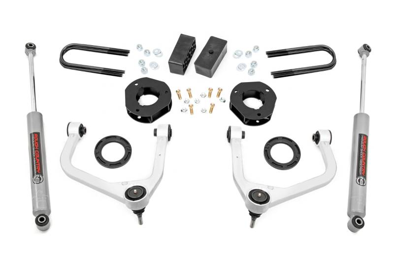 Explore New Heights: GMC's fifth-generation Sierra 1500 features an impressive all-new design that's built from the ground up, with aggressive angles and head-turning stylings that fit in beautifully when transformed with Rough Country's 3.5-inch Suspension Lift.Innovative Design and Construction: When changing a vehicle's suspension, the key to preserving ride quality is keeping the geometry of all suspension components as close to their factory angles as possible. Rough Country's 3.5in lift features a set of forged aluminum upper control arms to provide the correct suspension geometry in our most durable control arm to date! This perfect-height lift is a great choice for anyone who wants more than a simple level but doesn't quite want the full height of a 6-inch option. This kit lifts and levels the front of the vehicle with the rear, offering enough increased ground clearance to run up to 295/55R20 tires with an improved, aggressive look. We didn't want to limit you to one standard kit. Rough Country's 3.5-inch kit is configurable with all the shock options that we offer. This allows you to choose which shock series you want! Ranging from our nitrogen-charged N3 shocks to our Vertex reservoir shocks the power to choose is in your hands.Installation: Requiring the use of a strut compressor to install, an estimated timeframe of 5-6 hours is recommended to complete this full installation. This full kit can be installed at home and can be completed efficiently and quickly!Limited Lifetime Replacement Warranty: Rough Country's 3.5" Suspension Lift Kit is backed with a limited lifetime replacement warranty towards manufacturer defects. As such, the product is protected from structural and workmanship damage after the date of purchase. With our industry-leading warranty give yourself peace of mind when using Rough Country's Suspension products!