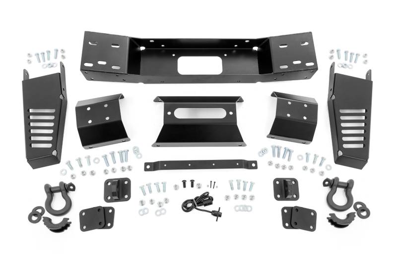 - Modular, 6-piece design (winch tray, fairlead mount, driver and pass wings, and two D-ring mounts) Easy bolt-on application minor trimming for fairlead and d-ring mounts. Winch is hidden behind factory bumper cover. Optional d-ring mounts included. Includes d-ring mount spacer plates. Includes remote harness connector. Replaces factory inner bumper structure. Compatible with Rough Country 20in Slim Line Bumper LED SKU: 71077..