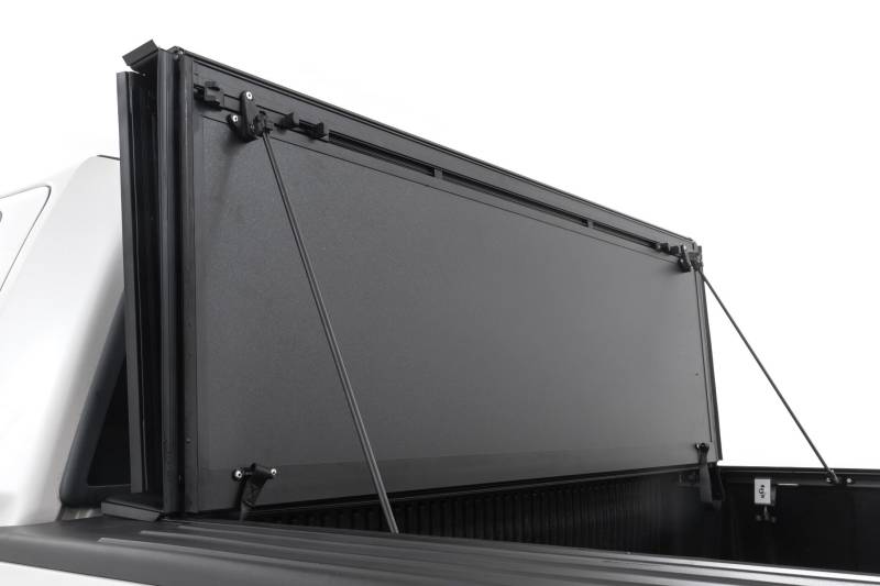 Elevate your F150's functionality and appearance with Rough Country's F-150 Hard Tri-fold Flip-up Bed Cover. Unlike traditional bed covers that limit access to your truck bed, our innovative Flip-up design grants you complete access to your truck bed, making it easier to load and unload large items.\ Full-Bed Access: With Rough Country's Tri-fold Flip-up Bed Cover, you can conveniently flip up the cover, allowing full-bed access without the hassle of removing the cover.\ Built to Last: Our bed cover is crafted from lightweight aluminum and boasts a resilient powder coat finish. This coating resists corrosion and wear, ensuring that your truck bed maintains its pristine appearance even in harsh weather conditions.\ Superior Water Drainage System: The bed rails of this bed cover feature an innovative water drainage system. No need to worry about water pooling on your cover or seeping into your truck bed.\ Premium Weather Seals: The Tri-fold cover also includes top-of-the-line weather-resistant seals that create a tight and secure barrier along the bed rails. These seals ensure your cargo remains protected from the elements, even in inclement weather.\ Secure Cargo Storage: Provide added security for your truck bed contents, deterring theft and protecting valuable items.\ Elevate your F-150's truck bed and get full access, unmatched durability, and superior weather protection with Rough Country's Hard Tri-fold Flip-up Bed Cover!