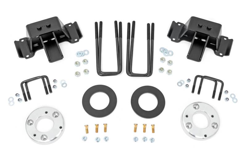 Improved Ground Clearance and Ride Quality. Looking for a way to take your Ford F-150 Raptor to new heights? Rough Country's 2.5 Inch Lift Kit is just what you need! This lift kit offers a clean, level look from front to rear and is designed to maintain ride quality, handling and performance while giving you room for larger tires.\ High-Quality Construction. Give your F-150 Raptor enough ground clearance to run up to 37x12.50 tires for an aggressive, lifted stance that compliments the rugged, monster design of the Raptor build. This all-inclusive kit features a set of durable upper strut spacers and preload spacers as well as a set of anti-wrap, fabricated rear blocks with built-in bumpstops! Once installed, this kit gives your truck plenty of ride height for up to 37in tires while offering a clean, level look from front to rear.\ Installation and Warranty. Rough Country's 2.5 Lift Kit is easy to install and includes all necessary hardware, making it a great option for those who want to do the job themselves. With an estimated installation time of 3-5 hours, this kit is a bolt-on install that can be completed at home. You also get peace of mind knowing that your purchase comes with a limited lifetime replacement warranty for manufacturer defects. With Rough Country's industry-leading warranty, you can be sure that your Rough Country lift kit is protected from structural and workmanship damage after the date of purchase.