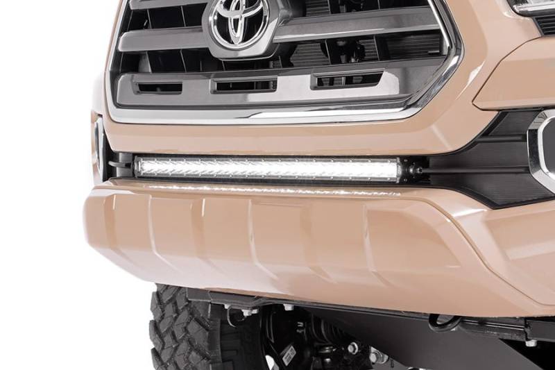 Give your Tacoma the power of off-road illumination with Rough Country's 30-inch Hidden Bumper LED Kit. This all-inclusive lighting kit fits perfectly into the factory opening on 2016+ Toyota Tacoma bumpers, housing a 30-inch LED Light bar for impressive lighting power.This kit includes Rough Country's popular 30" Single-Row CREE LED Light Bar, featuring a powerful 12,000 Lumen, 150-Watt output. The durable die-cast aluminum housing offers incredible protection while the IP67 Waterproof design wards off mud, water, and dust. The included mounts provide a clean, flush look that blends in so well you'll never see a Tacoma bumper the same way! It's the perfect position for extra lighting that you'll find handy time and time again. Includes Rough Country's 3-Year LED Warranty and a Lifetime Warranty on the mounting system.