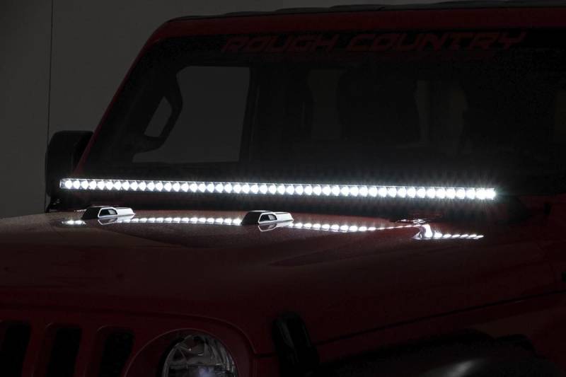 COMMAND THE DARK with Rough CountryΓÇÖs 50in LED Hood Kit! This awesome, easy-to-install LED upgrade gives your Jeep JL a menacing look and incredible off-road illumination.This kit features Rough CountryΓÇÖs 50in, straight, single-row LED light bar for a sleek look that leaves plenty of visibility while blending in perfectly with the JLΓÇÖs aggressive front-end design. This setup provides a staggering 19,200 lumens and 240 watts of forward-facing LED power and is available in your choice of Chrome-Series or Black-Series LED for the style that suits your build the best! Each Rough Country LED light bar is IP67 Waterproof and includes a premium, braided wiring harness with in-line fuse and on/off switch!This easy-to-install kit features a 100% bolt-on installation procedure, with no need for cutting or drilling on your brand new Jeep, and does not interfere with the windshield washer nozzle or spray pattern! Includes Rough CountryΓÇÖs 3-year LED warranty and lifetime mounting bracket warranty!