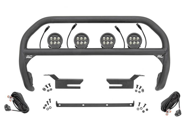 Outfit your 2021 Bronco right with Rough Country's Nudge bar. This durable 3-inch thick tubular steel bull bar provides unbeatable protection for the front side of your vehicle all while offering multipe LED mounting solutions to provide ample lighting for the trail ahead.\ \ This easy-to-install bull bar features a 100% bolt-on installation process, giving you a simple way to add this eye-catching upgrade that provides protection from hazards on and off-road. Each Nudge Bar is coated with corrosion-resistant black powder coat to ensure a long-lifespan for years to come.\ \ Rough Country's Nudge Bar can be equipped with four round LED lights, or a single row 20" LED light bar! Rough Country's all-weather LED lights feature a durable, die-cast aluminum housing and include a premium, waterproof, flat-wound, braided wiring harness with toggle switch and in-line fuse.