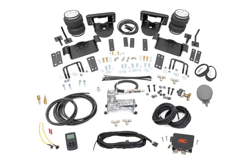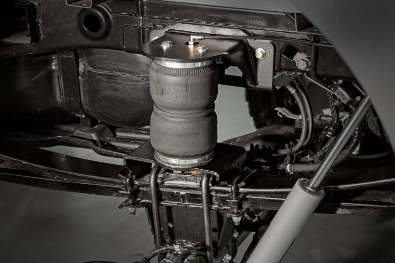 Ideal Leveling. Is your truck your workhorse? The main attraction to the pick-up line is the accessibility to haul and tow as desired. However, due to the amount of weight in the bed, or the condition of the vehicle's rear leaf springs, this can cause the vehicle to be un-level when under load. Here at Rough Country, we created an innovative new product to ensure that these are troubles of the past. Introducing, Rough Country's Rear Air Spring Kit.Heavy-duty Construction. Rough Country's Rear Air Spring Kit features two RC branded high-quality double convoluted airbags complemented with DOT-approved airlines. Whether you plan on towing or hauling in the not-so-distant future Rough Country's Air Spring kit is the must-have accessory to ensure that your trailer is level reducing the weight off of the tongue of your trailer. Each kit offers 1/4" push connector fittings and all of the bracketry needed to ensure installation is lightning fast and secure! Rough Country's Air Spring kit provides up to 5,000 lbs of load support to ensure that you experience less sway and bottoming out when braking and steering! \ Installation. With an estimated timeframe of 1-2 hours this full kit can be installed at home using standard tools and can be completed efficiently and quickly!\ Limited Lifetime Replacement Warranty. Rough Country's Rear Air Spring Kit is backed with a limited lifetime replacement warranty towards manufacturer defects. As such, the product is protected from structural and workmanship damage after the date of purchase. With our industry-leading warranty give yourself peace of mind when using Rough Country's Suspension products!