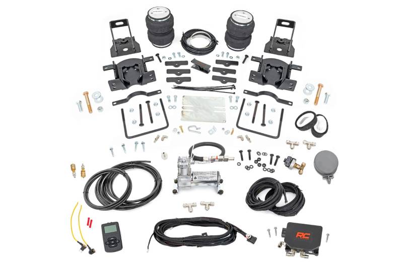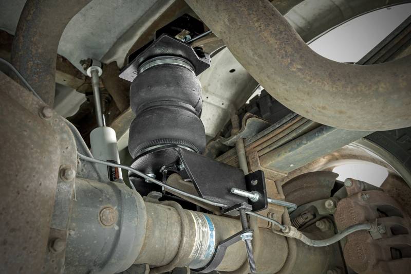Ideal Leveling. Is your truck your workhorse? The main attraction to the pick-up line is the accessibility to haul and tow as desired. However, due to the amount of weight in the bed, or the condition of the vehicle's rear leaf springs, this can cause the vehicle to be un-level when under load. Here at Rough Country, we created an innovative new product to ensure that these are troubles of the past. Introducing, Rough Country's Rear Air Spring Kit.Heavy-duty Construction. Rough Country's Rear Air Spring Kit features two RC branded high-quality double convoluted airbags complemented with DOT-approved airlines. Whether you plan on towing or hauling in the not-so-distant future Rough Country's Air Spring kit is the must-have accessory to ensure that your trailer is level reducing the weight off of the tongue of your trailer. Each kit offers 1/4" push connector fittings and all of the bracketry needed to ensure installation is lightning fast and secure! Rough Country's Air Spring kit provides up to 5,000 lbs of load support to ensure that you experience less sway and bottoming out when braking and steering! \ Installation. With an estimated timeframe of 1-2 hours this full kit can be installed at home using standard tools and can be completed efficiently and quickly!\ Limited Lifetime Replacement Warranty. Rough Country's Rear Air Spring Kit is backed with a limited lifetime replacement warranty towards manufacturer defects. As such, the product is protected from structural and workmanship damage after the date of purchase. With our industry-leading warranty give yourself peace of mind when using Rough Country's Suspension products!