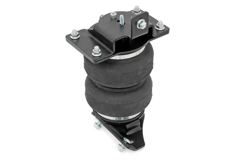 Ideal Leveling. Is your truck your workhorse? The main attraction to the pick-up line is the accessibility to haul and tow as desired. However, due to the amount of weight in the bed, or the condition of the vehicle's rear leaf springs, this can cause the vehicle to be un-level when under load. Here at Rough Country, we created an innovative new product to ensure that these are troubles of the past. Introducing, Rough Country's Rear Air Spring Kit.Heavy-duty Construction. Rough Country's Rear Air Spring Kit features two RC branded high-quality double convoluted airbags complemented with DOT-approved airlines. Whether you plan on towing or hauling in the not-so-distant future Rough Country's Air Spring kit is the must-have accessory to ensure that your trailer is level reducing the weight off of the tongue of your trailer. Each kit offers 1/4" push connector fittings and all of the bracketry needed to ensure installation is lightning fast and secure! Rough Country's Air Spring kit provides up to 5,000 lbs of load support to ensure that you experience less sway and bottoming out when braking and steering! \ Installation. With an estimated timeframe of 1-2 hours this full kit can be installed at home using standard tools and can be completed efficiently and quickly!\ Limited Lifetime Replacement Warranty. Rough Country's Rear Air Spring Kit is backed with a limited-lifetime replacement warranty towards manufacturer defects. As such, the product is protected from structural and workmanship damage after the date of purchase. With our industry-leading warranty give yourself peace of mind when using Rough Country's Suspension products!