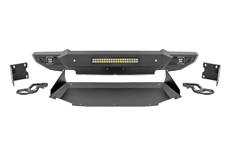 - Easy to install!\ No Cutting or Drilling.\ Slim, Sleek design that follows factory features.\ Durable, steel construction.\ Integrated skid plate.\ Includes (2) Rough Country LED Cubes.\ Includes 20in Dual Row Rough Country LED Light Bar.\ Retains factory tow hooks.\ Retains factory proximity sensors.\ .