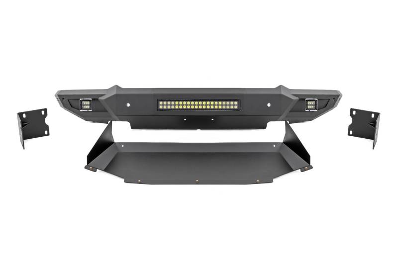 - Easy to install!\ No Cutting or Drilling.\ Slim, Sleek design that follows factory features.\ Durable, steel construction.\ Integrated skid plate.\ Includes (2) Rough Country LED Cubes.\ Includes 20in Dual Row Rough Country LED Light Bar.\ Retains factory tow hooks.\ Retains factory proximity sensors.\ .