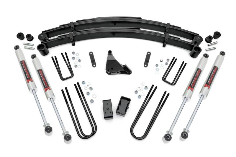 Give your 99-04 Ford Super Duty an impressive upgrade, front to back with Rough Country's 4" Ford Suspension Lift Kit! This easy-to-install lift kit raises the front of your vehicle to be equal height with the rear for a leveled, better-than-stock look that gives an improved ride height and more aggressive appearance.\ This kit features a set of front, lifted leaf springs allowing you gain additional ride height without sacrificing ride quality or performance. A set of sway bar drop brackets and track bar bracket are provided to keep everything at optimum angles for a factory-like ride, even after lifting.\ A set of Rough Country's premium N3 shocks are also included. These fine tuned 10-stage variable high-pressure Nitrogen charged shocks offer a fantastic blend of off-road action and smooth highway ride quality. With a durable 18mm spring-loaded piston rod and faster-cooling 54mm shock body.\ Get the wheels you want! Rough Country's 4" 99-04 Ford Suspension Lift Kit comes with everything you need to fit up to a 35" tire with proper wheel backspacing.\ Best of all, Rough Country's 4" Ford Suspension Lift Kit is backed by our Lifetime Replacement Warranty.