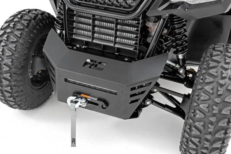 Upgrade your Honda Pioneer. Rough Country's Winch Mount is the perfect solution for off-road enthusiasts who demand superior performance and durability from their UTV. This winch mount replaces your stock front bumper and allows for the addition of a sleek 10" Slim Line LED light, perfect for shining a bright path on even the darkest of trails. And with a design specifically crafted to fit a 4500lb winch, you'll be able to tackle even the toughest of off-road challenges with ease. Say goodbye to wimpy stock bumpers and hello to the brute strength of Rough Country's Winch Mount for the Honda Pioneer 520 4WD!\ Durable Construction.?ǻCrafted with durability in mind, the winch mount is made of 7-gauge material and coated with a gloss black powder finish. This ensures long-lasting protection against rust and corrosion and a sleek and stylish look. Installing the winch mount is a breeze thanks to its easy bolt-on design, which requires no cutting or drilling of your Honda Pioneer 520 4WD. Get ready to hit the trails with confidence, knowing that your winch mount is secure and built to last. Upgrade to Rough Country's Winch Mount today and take your off-road adventures to the next level.