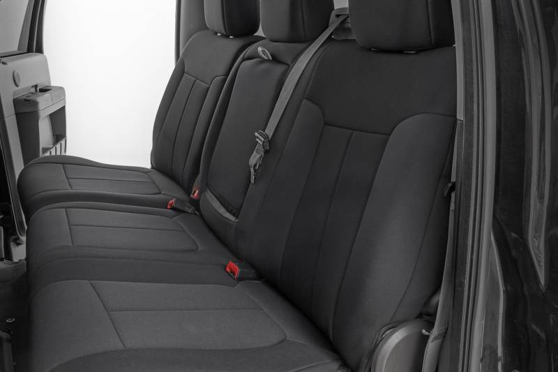 Want to protect your seats or are your seats showing signs of wear and tear from daily use? Say goodbye to unsightly stains and deterioration with Rough Country's Neoprene Seat Covers - the ultimate solution for preserving your vehicle's interior.Snug Fit for Optimal Protection: Our seat covers are tailored to fit your seats perfectly, providing a protective barrier against spills, scratches, and everyday wear and tear.Factory-Spec Construction: Engineered to meet factory specifications, our covers blend seamlessly with your vehicle's interior, giving it a fresh, new look without compromising on quality or style.Four-Layer Defense: With a four-layer construction featuring foam padding and a durable polyester shell, our seat covers offer unmatched protection and longevity, ensuring your seats stay looking new for years to come.Breathable and Water-Resistant: The neoprene layer not only provides breathability for added comfort but also boasts water-resistant properties, safeguarding your seats from spills and stains.Complete Coverage: Our covers come with full protection for your front seats, including headrest covers where applicable, as well as rear covers to shield your back seats from children and pet-related mishaps.Peace of Mind Warranty: Rest easy knowing your purchase is backed by our two-year warranty, giving you confidence in the durability and reliability of our product.Don't let worn-out seats diminish your driving experience. Upgrade to Neoprene Seat Covers today and enjoy a fresh, stylish interior that's protected against the rigors of daily life on the road.