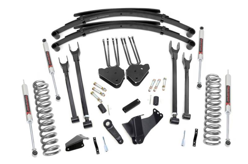 Compliment your 05-07 Ford F-250/350's aggressive, good looks with Rough Country's 4-Link Suspension Lift System. Rough Country's 6-inch Lift Kit was engineered to retain the F-250/350's impressive factory specs while bumping up performance and durability where it's needed most. The result is an aggressive, lifted beast with a mean profile and balanced on and off-road ride quality.\ When changing a vehicle's suspension, the key to preserving ride quality is in keeping the geometry of all suspension components as close to their factory angles as possible. Rough Country's 4-Link Suspension Lift System features a set of ultra-durable radius arm drop brackets, precision fit to bolt right into the factory mounts for an easier install and a more factory-like angle.\ This all-inclusive kit also features an adjustable lower control arms at the axle to allow caster adjustment as well as a track bar relocation bracket and a drop pitman arm. A full set of N3 Shocks provide a truly balanced ride quality for on and off-road use - prefect for daily drivers. This kit also ships with a set of durable, lifted coil springs and brake line relocation brackets.\ This innovative kit design features a 100% bolt-on installation process that is lightning fast compared to other kits this size. Save time and money with no need for cutting, drilling, or other complicated procedures. Rough Country's Rough Country's 4-Link Suspension Lift System is backed by our Lifetime Replacement Warranty.