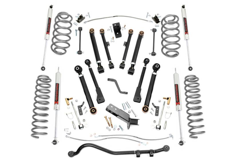 Total Transformation, On and Off the Trail: Give your Jeep TJ the ultimate upgrade with Rough Country's 4in X-Series Suspension Lift Kit. This all-inclusive package delivers everything you need for aggressive styling, increased ground clearance, and enhanced off-road capability.Precision Adjustable Control Arms: This kit includes front and rear upper and lower X-Flex Control Arms featuring a high-clearance design. Built with OEM-style rubber bushings, fully rebuildable flex joints, and massive 2.5" diameter bodies with 1.25" threads, these control arms are fully greasable for long-lasting durability and superior articulation. Fine-tune your ride height and suspension geometry with ease.Optimized Suspension Geometry: Lifted coil springs provide the perfect combination of ride height and vibration dampening, delivering optimal suspension performance across any terrain. This kit also includes durable stainless steel brake lines for improved reliability and safety.Heavy-Duty Forged Adjustable Track Bar: When it comes to strength and stability, the forged solid steel Adjustable Front Track Bar delivers. Weighing a robust 16 pounds, this track bar outmatches stock components, ensuring precise axle alignment and control even during extreme off-road flexing. It's fully adjustable on the vehicle and easy to install.Custom Shock Options for Any Terrain: Choose your ideal ride with Rough Country's premium shock upgrades. The included nitrogen-charged N3 shocks offer 10-stage variable valving and a 54mm shock body for faster cooling and up to 36kN tensile strength. For those craving next-level performance, optional V2 performance shocks or M1 monotube shocks are available to match your driving style.Confident, Balanced Stance: This lift kit levels the front of your Jeep with the rear, delivering a commanding, well-balanced look that performs as good as it looks.Peace of Mind Guaranteed: Backed by Rough Country's Limited Lifetime Replacement Warranty, you can hit the trails with confidence knowing your investment is protected.