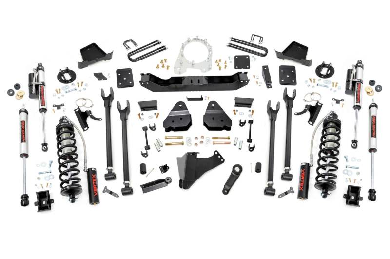 Superior Ride Quality. Give your fourth-generation Ford Super Duty an impressive upgrade and incredible ride quality with Rough CountryΓÇÖs 4-Link Coilover Conversion Lift Kit! This must-have kit is the pinnacle of suspension upgrades. Providing ride height adjustability, increased dampening, and killer good looks. You're sure to set yourself apart from the pack. This innovative kit allows you to replace your factory arms with a 4-Link setup, using Rough CountryΓÇÖs durable, fixed upper arms and adjustable lower control arms. A set of radius arm drop brackets maintain proper geometry and allow for proper caster setting, which is crucial to maintaining factory handling.\ Durable Components. Rough CountryΓÇÖs 6" 4-Link Coilover Conversion Lift Kit features top-mounted reservoir brackets and coil-over mounts constructed from 1/4-inch steel. Utilizing this conversion kit you're removing the factory independent coil shock and coil set-up and replacing it with a massive 2.5in piston, nitrogen-charged, 8-stage adjustable Vertex Coilover. Rough CountryΓÇÖs Vertex Coilovers feature a monotube design with an external reservoir for increased oil capacity and damping sensitivity. When it comes to investing in a high-end kit, youΓÇÖll be pleased to find that Rough CountryΓÇÖs 2.5in piston design is beefier and offers an impressive 56% greater fluid capacity than the average reservoir shock. Each kit is paired with a monotube shock that provides optimal damping control.\ Installation. Requiring cutting and drilling to install, an estimated timeframe of 6-10 hours is recommended to complete this full installation. This full kit can be installed at home and can be completed efficiently and quickly!\ Limited Lifetime Replacement Warranty. Rough CountryΓÇÖs 4-Link Coilover Conversion Lift Kit is backed with a limited lifetime replacement warranty towards manufacturer defects. As such, the product is protected from structural and workmanship damage after the date of purchase. With our industry-leading warranty give yourself peace of mind when using Rough Country's Suspension products!