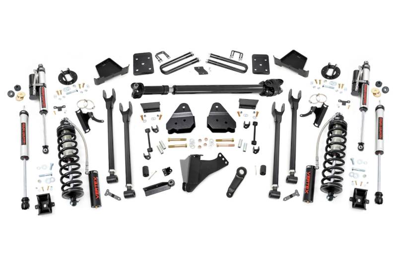Superior Ride Quality. Give your fourth-generation Ford Super Duty an impressive upgrade and incredible ride quality with Rough Country's 4-Link Coilover Conversion Lift Kit! This must-have kit is the pinnacle of suspension upgrades. Providing ride height adjustability, increased dampening, and killer good looks. You're sure to set yourself apart from the pack. This innovative kit allows you to replace your factory arms with a 4-Link setup, using Rough Country's durable, fixed upper arms and adjustable lower control arms. A set of radius arm drop brackets maintain proper geometry and allow for proper caster setting, which is crucial to maintaining factory handling. Durable Components. Rough Country's 6" 4-Link Coilover Conversion Lift Kit features top-mounted reservoir brackets and coil-over mounts constructed from 1/4-inch steel. Utilizing this conversion kit you're removing the factory independent coil shock and coil set-up and replacing it with a massive 2.5in piston, nitrogen-charged, 8-stage adjustable Vertex Coilover. Rough Country's Vertex Coilovers feature a monotube design with an external reservoir for increased oil capacity and damping sensitivity. When it comes to investing in a high-end kit, you'll be pleased to find that Rough Country's 2.5in piston design is beefier and offers an impressive 56% greater fluid capacity than the average reservoir shock. Each kit is paired with a monotube shock that provides optimal damping control. Installation. Requiring cutting and drilling to install, an estimated timeframe of 6-10 hours is recommended to complete this full installation. This full kit can be installed at home and can be completed efficiently and quickly! Limited Lifetime Replacement Warranty. Rough Country's 4-Link Coilover Conversion Lift Kit is backed with a limited lifetime replacement warranty towards manufacturer defects. As such, the product is protected from structural and workmanship damage after the date of purchase. With our industry-leading warranty give yourself peace of mind when using Rough Country's Suspension products!