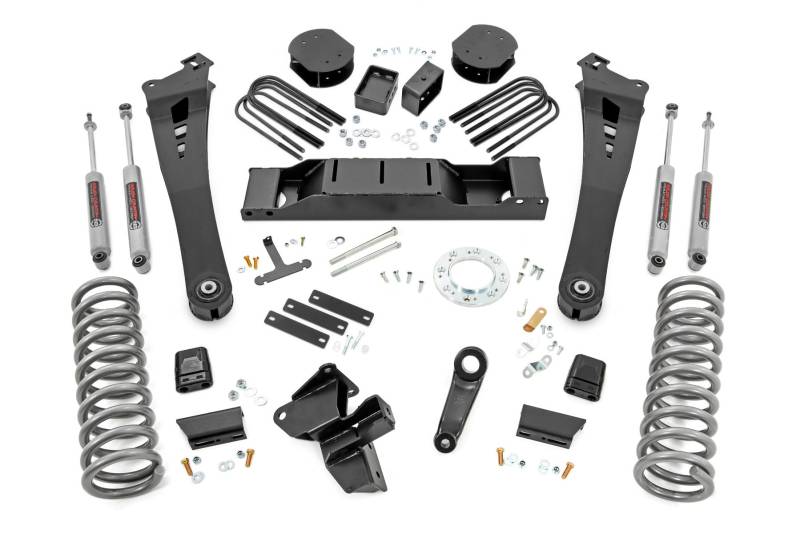 Unmatched Height: Compliment your RAM 3500's aggressive, good looks with Rough Country's new 5-inch Lift Kit with lifted coil springs. New model RAM Trucks come with a wealth of impressive features right from the factory. Rough Country's new 5-inch kit was engineered to retain these impressive factory specs while bumping up performance and durability where it's needed most. The result is a lifted beast with a mean profile and lush ride quality that'll make other Ram owners wonder where you got yours from!Durable Design: When changing a vehicle's suspension, the key to preserving ride quality is in keeping the geometry of all suspension components as close to their factory angles as possible. Rough Country's new 5-inch Suspension kit features a set of ultra-durable Radius Arms, precision fit to bolt right into the factory mounts for an easier install and a more factory-like angle. These beefy, upgraded Radius Arms also feature a durable, durable rubber bushings for maximum vibration absorption. This kit also includes a skid plate and a set of front, lifted coil springs for unparalleled ride quality from your lifted Ram 3500.Installation and Warranty: Our 5-inch Suspension Lift Kit provides an easy bolt-on installation with minor cutting and drilling required. Install time is just 6-8 hours, and all the hardware and instructions are included in the kit. Plus, our suspension lift kits are backed by Rough Country's Limited Lifetime Replacement Warranty, so you can rest assured that your investment is protected. So order your kit today and get your Ram 3500 looking its best!