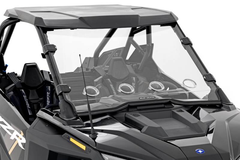 Added Protection and comfortability. Protect the occupants of your Polaris RZR from off-road hazards such as rocks, branches, and other debris with Rough Country's Scratch-Resistant Windshields. UTV Windshields offer a clear visual of the trail ahead and allow for a much more comfortable outing!\ High-Quality Polycarbonate Construction. Rough Country UTV windshields are constructed from thick polycarbonate material that is precision cut for a perfect fit. The polycarbonate material provides an ideal combination of clarity, flexibility, durability that outperforms glass, acrylic, and other windshield materials.\ Durable Scratch and UV Resistance. Each windshield is not only constructed from thick polycarbonate material but enhanced by a secondary AR2 hard-coating process. This process completely coats the windshield with a hardened, scratch-resistant barrier. This treatment also provides the additional benefit of UV protection.\ Easy Installation. With a simple strap-on installation process, installing a Rough Country windshield couldn't be easier. Within 15 ?Çô 30 mins you can be ready to hit the trails.\ Limited-Lifetime Replacement Warranty. Rough Country's Scratch-Resistant Windshields are backed with a limited lifetime replacement warranty towards manufacturer defects. As such, the product is protected from structural and workmanship damage after the date of purchase. With our industry-leading warranty give yourself peace of mind when using Rough Country's Suspension products!