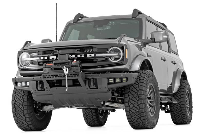 Superior Looks. Looking to take your off-roading game to the next level? Then you need a High Winch Mount! This bad boy works with factory steel modular bumpers for your Ford Bronco and allows the installation of 9500lb or larger winches - perfect for those who like to live on the wild side. Our High Winch Mount also includes an optional 20-inch light bar so you can see what you're getting into. So whether you're an experienced off-roader or just looking to take your adventures to new heights, the High Winch Mount is a must-have!\ Heavy Duty Construction. This mount is engineered for heavy-duty use, with a 1/4" thick mild steel winch tray and mounts. It also includes 1/4" thick spacers to clear factory tow hooks to install your winch above the factory steel modular bumper. The Bronco High Winch Mount also keeps your adaptive cruise control system in working order, so you can enjoy all the benefits of off-roading without sacrificing safety or style. With this mount, you'll be able to take on any terrain with confidence!\ Installation and Warranty. Rough Country's High Winch Mount includes installation instructions and necessary hardware. In addition, this product is backed with a limited lifetime replacement warranty for manufacturer defects. As such, the product is protected from structural and workmanship damage after the date of purchase. With our industry-leading warranty, give yourself peace of mind when using Rough Country's products!