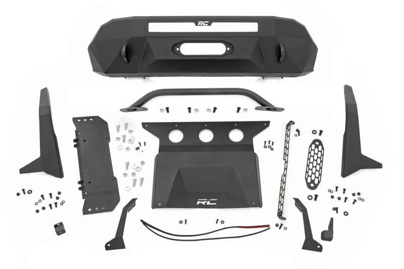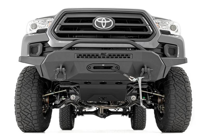 - High-Clearance Pre-Runner Design: Aggressive pre-runner styling enhances approach angles for superior off-road performance while giving your Tacoma a bold, rugged look.\ Modular Configuration: Fully modular design allows you to customize your bumper setup to match your exact needs and preferences.\ Optional LED Upgrade Kit: Add Rough Country's 20-Inch Single Row LED Light Bar, available with or without White DRL feature, delivering a powerful 7200 lumens for maximum visibility.\ Integrated Trim Panels: Includes trim panels designed specifically for seamless installation of the optional LED light.\ Winch-Ready Design: Comes with a pre-installed winch mounting plate to accommodate your off-road recovery needs.\ Optional Winch Upgrade Combos: Compatible with Rough Country PRO9500S or PRO12000S winches for ultimate recovery power.\ Durable Black Powder Coat Finish: Long-lasting black finish resists corrosion, scratches, and daily wear while maintaining a sleek, aggressive look.\ D-Ring Recovery System: Includes D-Ring mounts and heavy-duty D-Rings for reliable recovery points on the trail..
