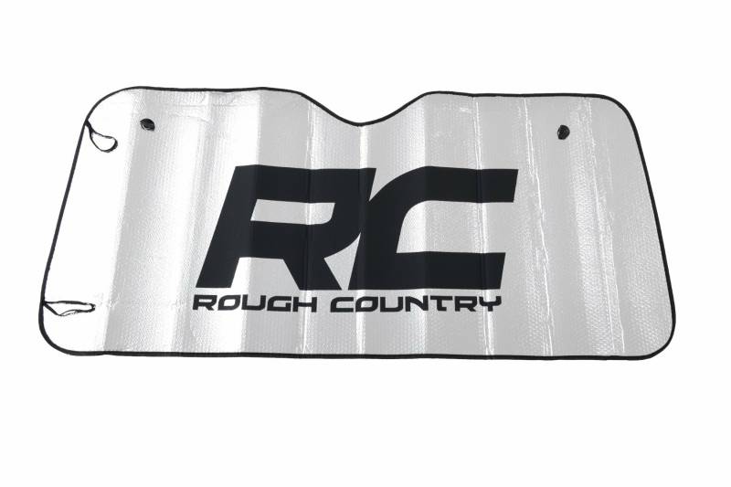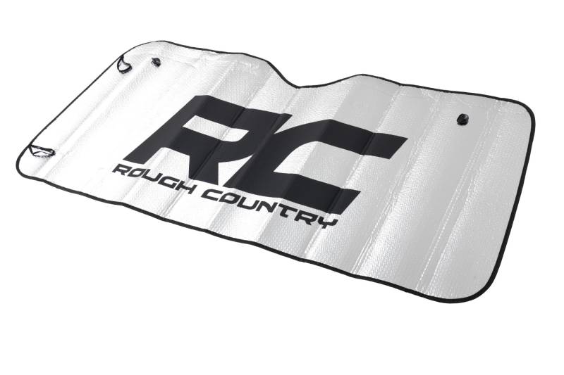 Beat the Heat! Whether you are driving your truck home or headed to another off-road adventure, no one likes to sit down and drive a hot vehicle that's been sitting in the sun for hours. Rough Country's Windshield Sunshade is a must-have if you spend a long day parked in the hot sun. Designed to fit the windshields of most trucks and Jeeps, this universal shade protects your ride against the hot summer sun.\ Durable Protection. The flexible material contours to your window to help reflect UV rays that cause fading and cracking to the dash, steering wheel, and seats. Our sunshades are made with reflective aluminum foil combined with a bubble material that significantly lowers your vehicle's temperature. And with the lightweight design, it folds easily for storage. So beat the heat this summer with our Windshield Sun Shades. Your vehicle will thank you!