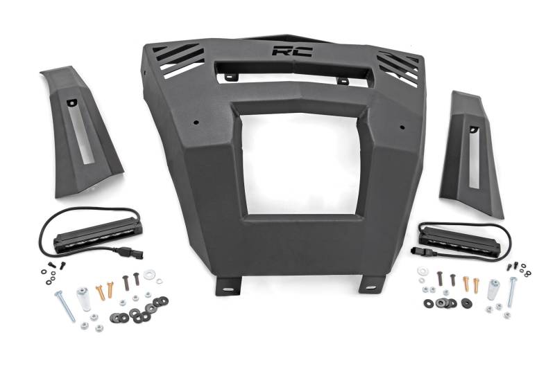 Superior Function: Upgrade your Can-Am Defender's front end with Rough Country's Front Bumper Kit, now available with optional 6" Slimline LED lights in the wings or a 12" Black Series light bar in the center. This rugged bolt-on kit installs easily and follows your Defender's factory lines, giving your UTV a more aggressive, modern appearance while delivering exceptional front-end illumination for night or low-light adventures.Innovative, Durable Design: Crafted from 1/8" heavy-duty steel with a corrosion-resistant powder coat finish, these panels are built to withstand off-road impacts and tough elements. The removable outer wings allow for customization or accessory installation. Lighting options include dual 6" Slimline LED lights in the wings producing 4,800 lumens, or a full setup with dual 6" lights plus a 12" single-row Black Series light bar delivering a combined 9,600 lumens. Each LED light features IP67 waterproofing, ensuring reliable performance in all weather conditions. Effortless Installation: This 100% bolt-on bumper kit is designed for straightforward installation with standard tools. Estimated install time is 3-4 hours, with step-by-step instructions included, so you can upgrade your Defender at home quickly and efficiently.Limited Lifetime Replacement Warranty: Every Rough Country Front Bumper Kit is backed by a limited lifetime replacement warranty against manufacturer defects. Rest easy knowing your investment is protected from structural or workmanship issues, giving you confidence on every ride.